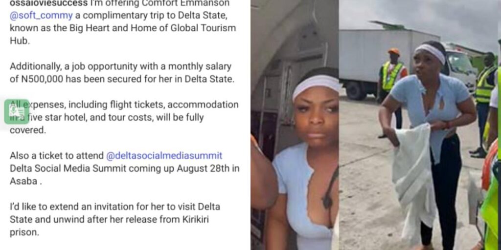 Ossai Ovie Success, Senior Special Assistant on Media to Delta State Governor Sheriff Oborevwori, has announced a special package for Comfort Emmanson, the Ibom Air passenger recently freed from Kirikiri Prison. In an Instagram post on Wednesday, Ossai revealed that he had secured a job in Delta State for Emmanson with a monthly salary of ₦500,000. He also promised to sponsor an all-expenses-paid trip to the state, including flight tickets, a stay in a five-star hotel, guided tours, and a ticket to the Delta Social Media Summit scheduled for August 28 in Asaba.