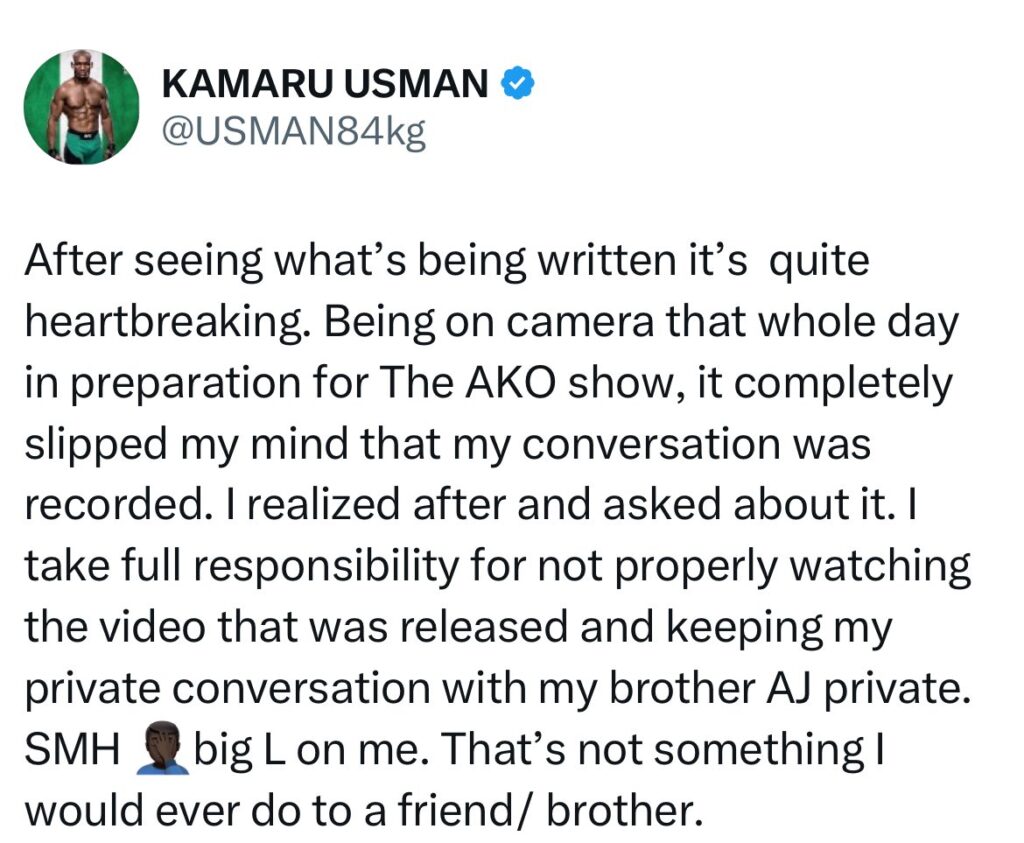 Explaining how the video was leaked, Usman admitted responsibility. He said he had been filming content throughout the day for an MMA-related project and failed to realise that his conversation with Joshua was included in the final edit that was later posted on Instagram.