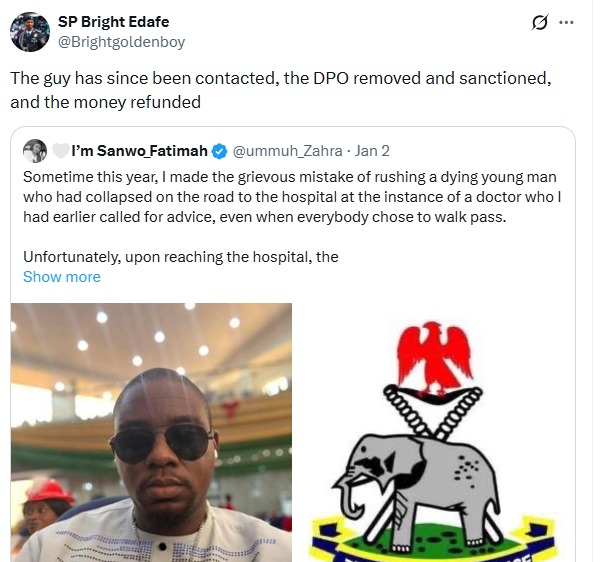Reacting to the incident on X, the spokesperson of the Delta State Police Command, SP Bright Edafe, confirmed that the DPO involved has been sanctioned and removed from office. He also disclosed that any money extorted from Wojuola during the incident has been fully refunded.