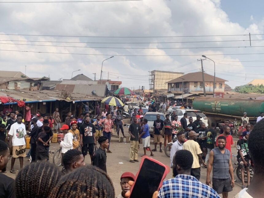 A large protest over recurring kidnappings in Ekpoma and surrounding communities in Esan West Local Government Area of Edo State disrupted commercial activities in the university town on Monday. The demonstrators, made up of students and residents, marched through the streets while chanting “We no go gree oo, we no go gree,” setting ablaze tyres and other objects along multiple sections of the Federal Highway to block traffic. Makeshift barriers were also erected, preventing vehicles from passing.
