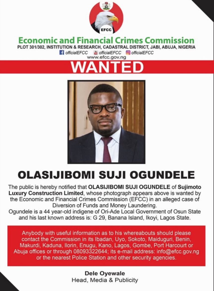 The Economic and Financial Crimes Commission (EFCC) has declared prominent businessman and real estate developer, Olasijibomi Ogundele of Sujimoto Luxury Construction Limited, wanted for alleged diversion of funds and money laundering.