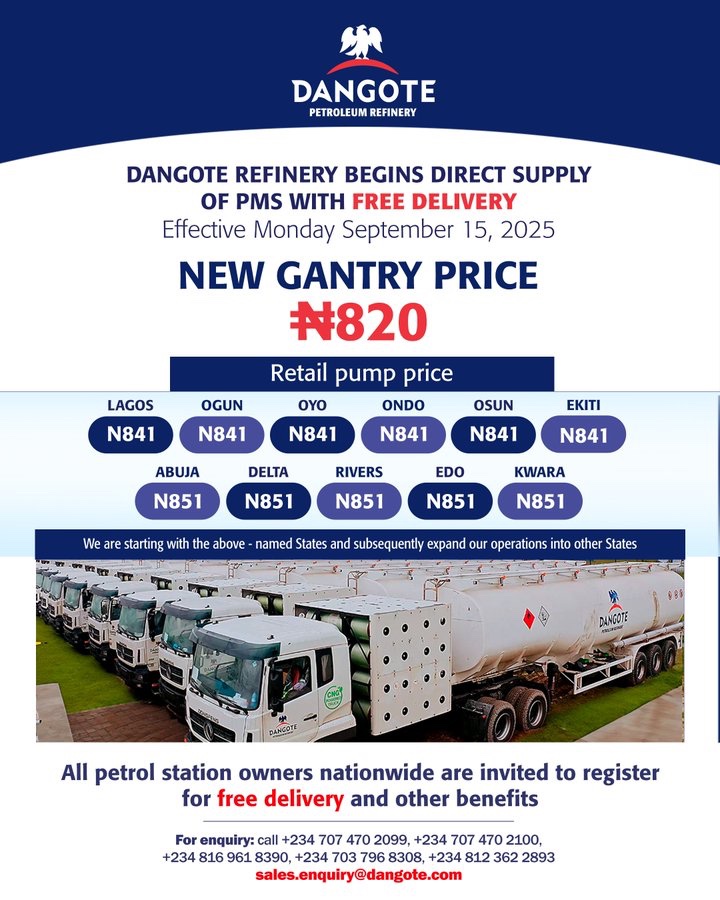 The Dangote Petroleum Refinery will on Monday, September 15, begin deploying compressed natural gas (CNG)-powered trucks under its logistics-free distribution programme, aimed at driving down fuel prices nationwide. According to a company statement, the new arrangement will cut the gantry price to N820 per litre, with retail pump prices in key states adjusted accordingly. In Lagos and other South-West states, petrol will sell at N841 per litre, while Abuja, Rivers, Delta, Edo, and Kwara will have pump prices set at N851 per litre.