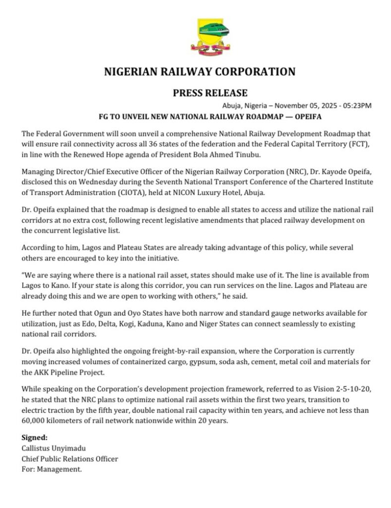 FG to unveil new National Railway Development Roadmap – OpeifaThe Federal Government is set to launch a comprehensive National Railway Development Roadmap aimed at achieving rail connectivity across all 36 states