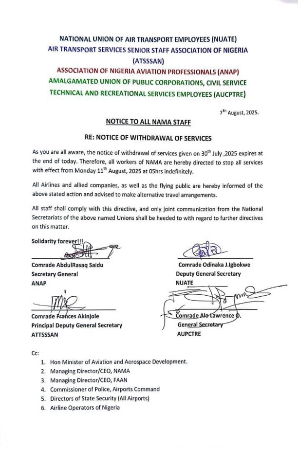 The National Union of Air Transport Employees (NUATE), alongside other major aviation unions, has escalated its dispute with the Nigerian government by issuing a notice of complete withdrawal of services, effective Monday, August 11, 2025, at 05:00 hours.
