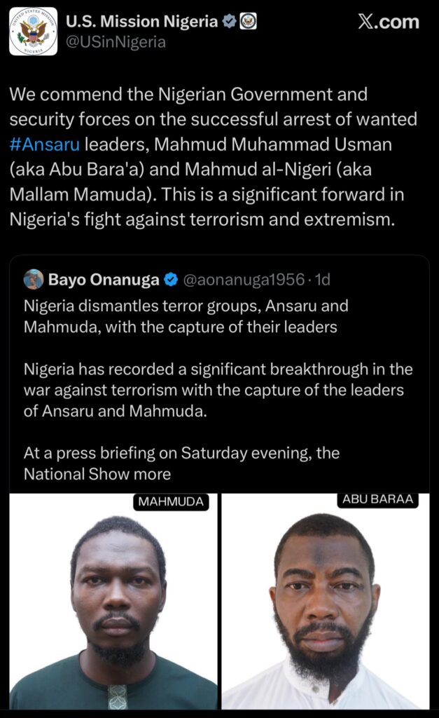The US Mission in Nigeria has commended the Federal Government and security forces for the arrest of two top leaders of the terrorist group, Ansaru. The National Security Adviser, Nuhu Ribadu, confirmed the arrests over the weekend, describing the operation as a “high-risk, intelligence-led counter-terrorism mission” carried out between May and July 2025.